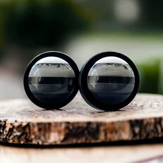 Black and White Striped Stud Earrings – Resin in Black Wood Bezel (12mm)