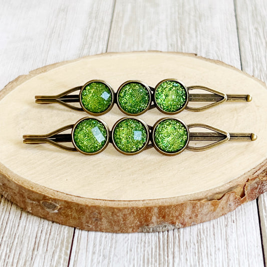 Green Shimmer Hair Pins – Sparkly Boho Hair Accessories Antique Bronze Finish