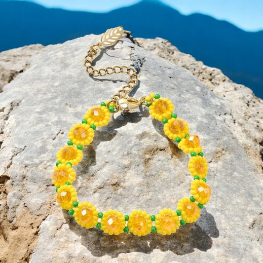 Handwoven Sunflower Bracelet – Yellow & Green Glass Bead Jewelry