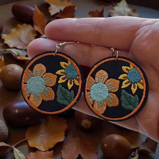 Boho Embroidered Floral Earrings – Teal & Mustard Sunflower Dangles