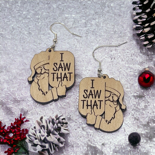 “I Saw That” Santa Earrings – Funny Etched Wood Christmas Jewelry