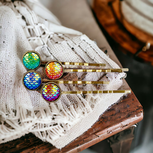 Brass Mermaid Hair Pins: Set of 4 in Purple, Green, Red, & Blue Colors for Enchanting Hairstyles