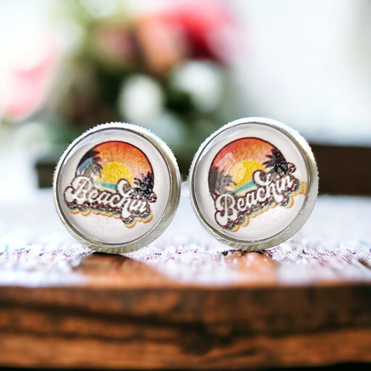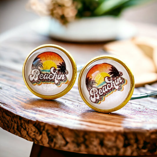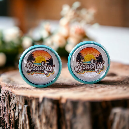 Beachin’ Sunset Stud Earrings – Retro Tropical Summer Jewelry with Teal Trim