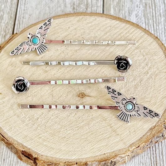 Turquoise Thunderbird & Rose Hair Pins - Set of 4 Boho Western Bobby Pins