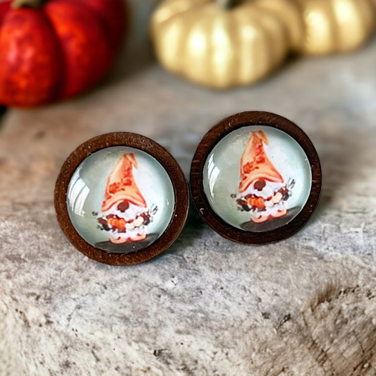 Gnome Pumpkin Stud Earrings – Whimsical Fall Harvest Jewelry in Wood