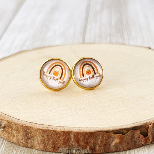 Boho Rainbow Happy Fall Y’all Gold Stud Earrings - Colorful & Festive Autumn Accessories