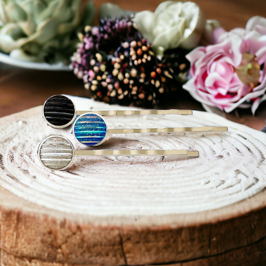 Blue, Black, & Silver Metallic Striped Hair Pins - Set of 3 Stylish Silver Hair Accessories