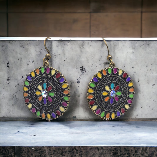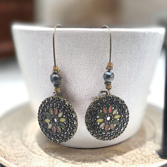 Colorful Floral Enamel Earrings – Boho Chic Bronze Dangle Jewelry