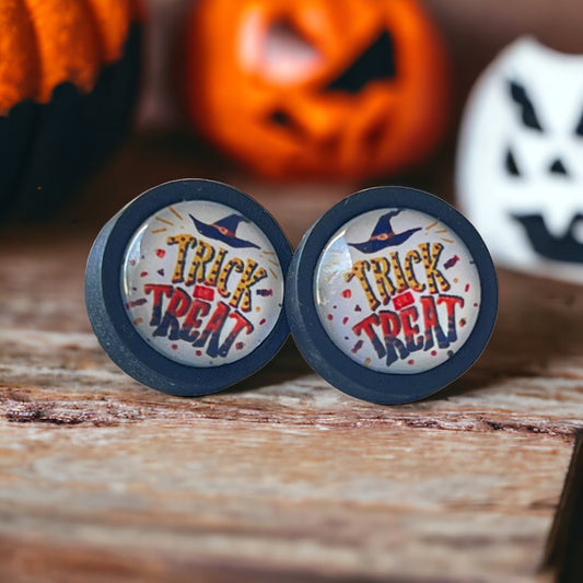 Trick or Treat Black Wood Stud Earrings - Spooky & Fun Halloween Accessories