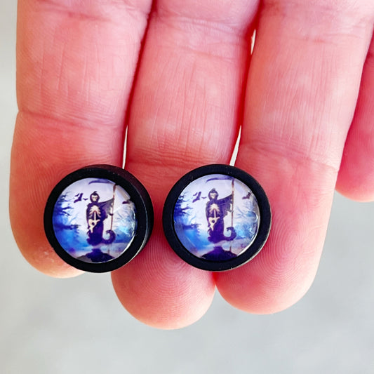 Grim Reaper Black Wood Stud Earrings - Spooky and Stylish Halloween Accessories