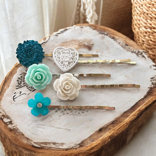 Blue & White Floral Hair Pins Set: Delicate Accessories for Elegant Hairstyles