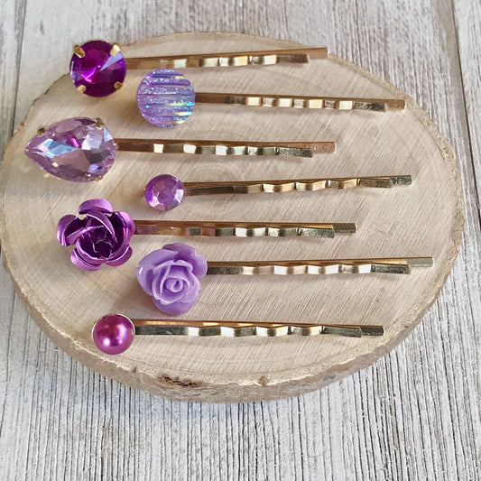 Purple & Gold Rhinestone Hair Pins - Floral Wedding Accessories