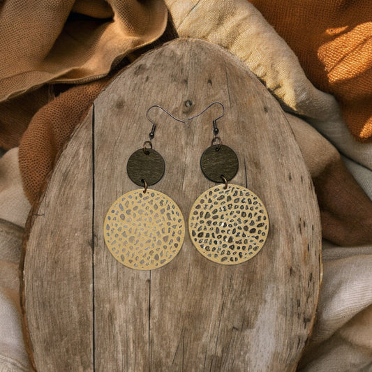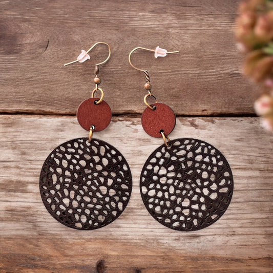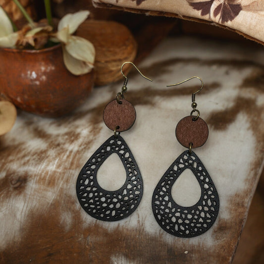 Wood & Black Leather Cutout Earrings – Boho Chic Jewelry