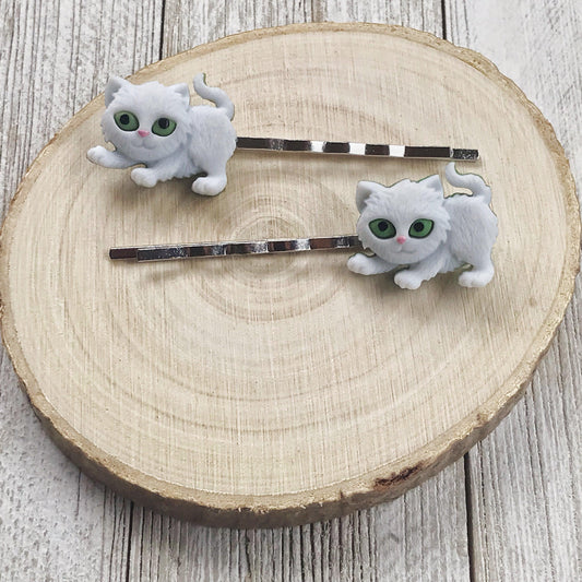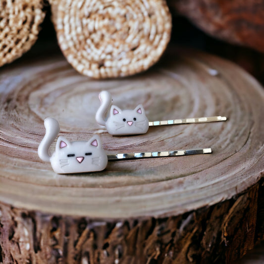 White Cat Hair Pins for Women - Set of 2 Feline Bobby Pins