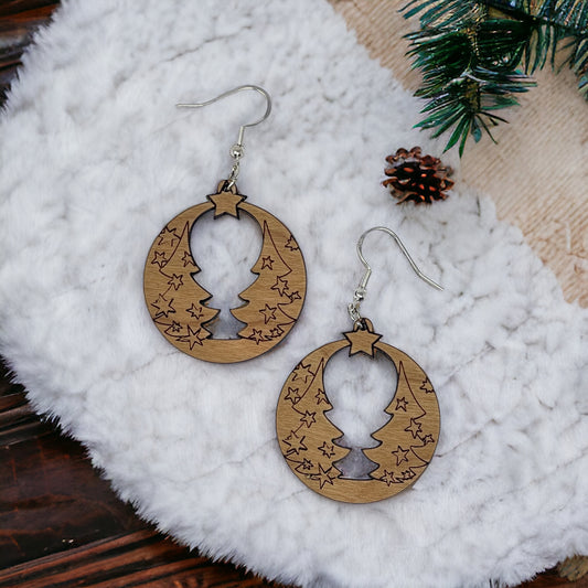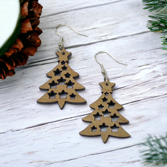 Wood Christmas Tree Earrings – Star Cutout Holiday Jewelry in Natural Wood