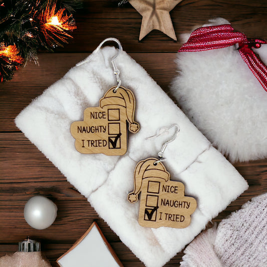 Funny Holiday Checklist Earrings – “I Tried” Santa Hat Wood Earrings