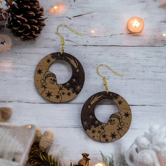 Snowman Moon Wood Earrings – Handmade Winter Jewelry