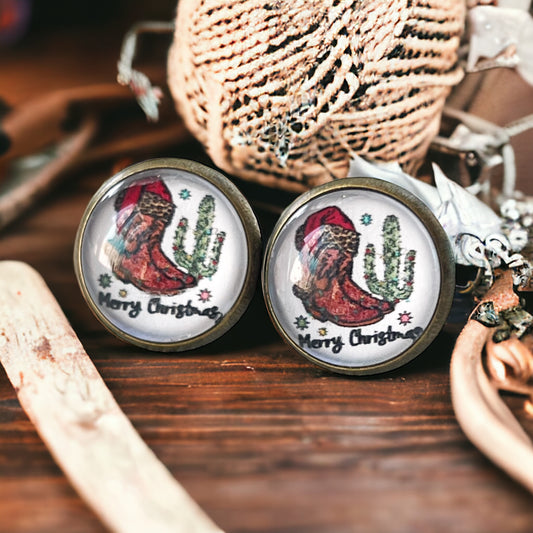 Western Cactus & Boot Merry Christmas Stud Earrings: Festive Southwest Charm