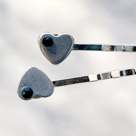 Silver Heart Hair Pins - Heart with Black Rhinestone Bobby Pin Set of 2