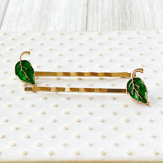 Green Enamel Leaf Hair Pins – Gold Boho Nature-Inspired Hair Clips