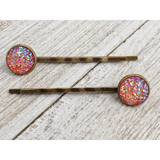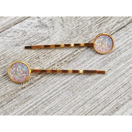 Rose Gold Druzy Hair Pins - Set of 2 Glittery Gold Bobby Pins