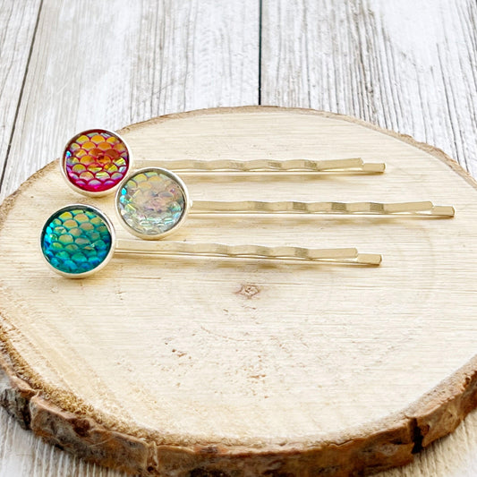 Silver Mermaid Hair Pins: Set of 3 in Pink, White, & Blue Colors