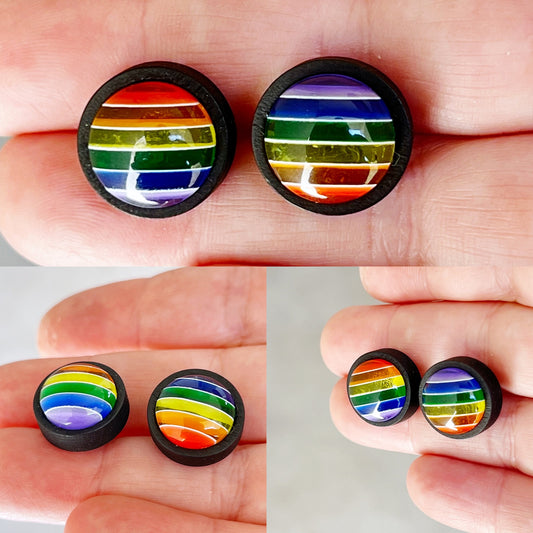 Rainbow Stripe Resin Stud Earrings – Colorful Handmade Jewelry in Black Wood