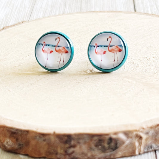 Flamingo Stud Earrings – Tropical Beach Jewelry in Teal Bezel Setting