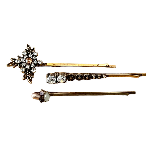 Gold Rhinestone & Pearl Hair Pins – Set of 3 Elegant Accessories