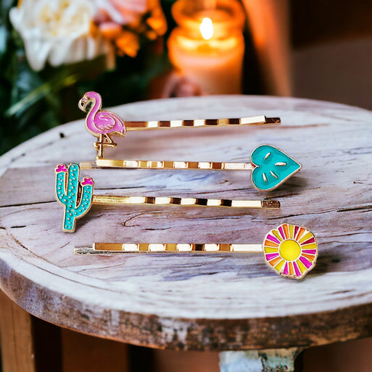 Tropical Vibes – Gold Bobby Pins with Flamingo, Cactus & Flowers