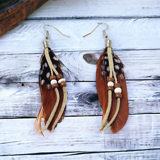 Brown Feather Dangle Earrings – Suede Accents Boho Chic Jewelry