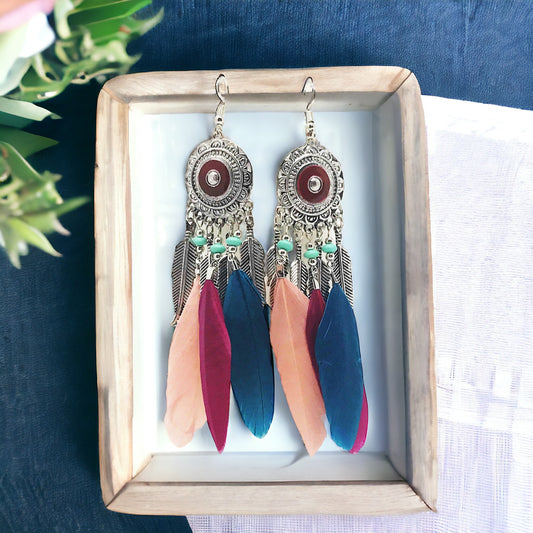 Pink & Blue Feather Dangle Earrings – Boho Chic Medallion Jewelry