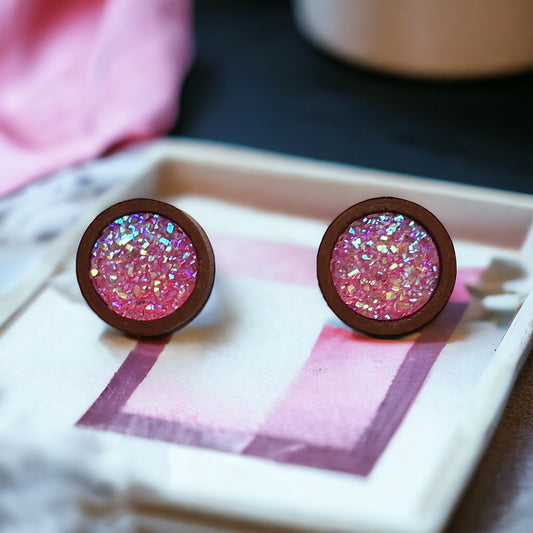 Pink Glitter Druzy Wood Stud Earrings – Handmade Boho Jewelry