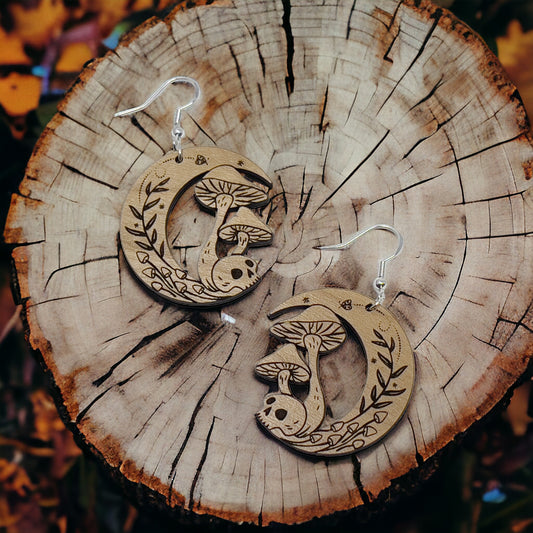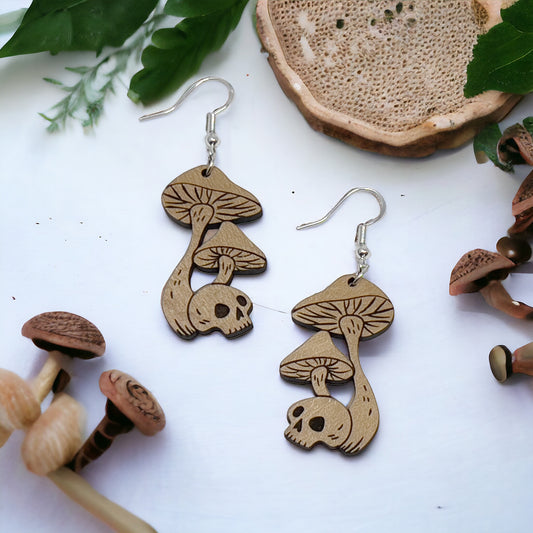 Skull & Mushroom Dangle Earrings – Spooky Wooden Fungi Halloween Jewelry