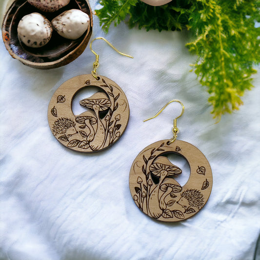 Hedgehog & Mushroom Wood Earrings – Whimsical Forest Jewelry