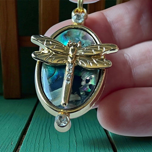 Abalone Dragonfly Purse Charm – Gold Insect Keychain with Etched Boho Details
