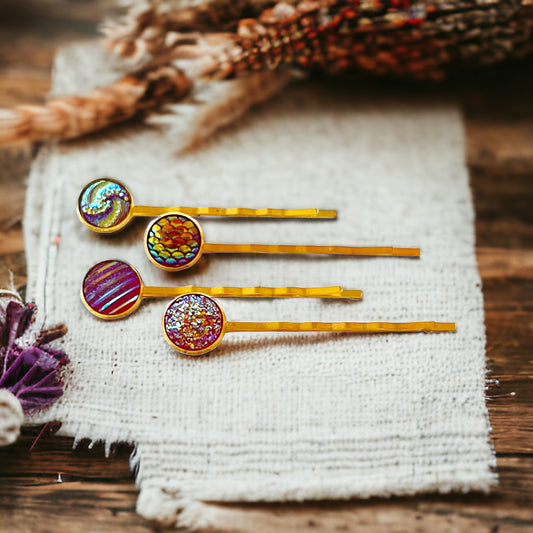 Set of 4 Gold Hair Pins: Textured Variety in Red Tones for Elegant Hairstyles