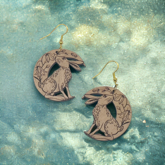 Wood Dangle Bunny & Lily Flower Easter Earrings - Boho Crescent Moon Rabbit Jewelry