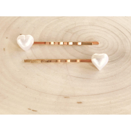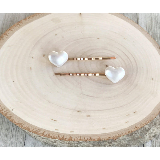 White Pearl Heart Hair Pins - Gold Bobby Pins Set of 2