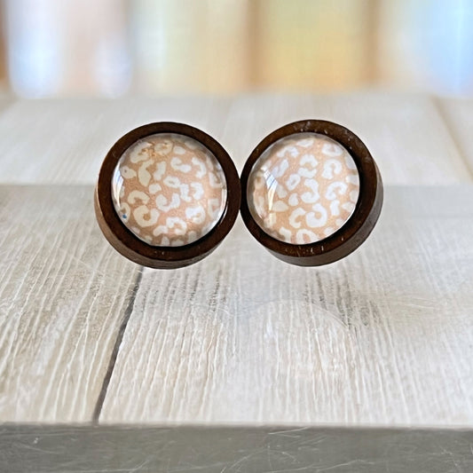 Beige Leopard Print Stud Earrings – Neutral Animal Pattern Wood Jewelry