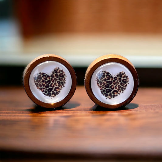 Wooden Leopard Print Heart Stud Earrings – Wild & Playful Statement Jewelry