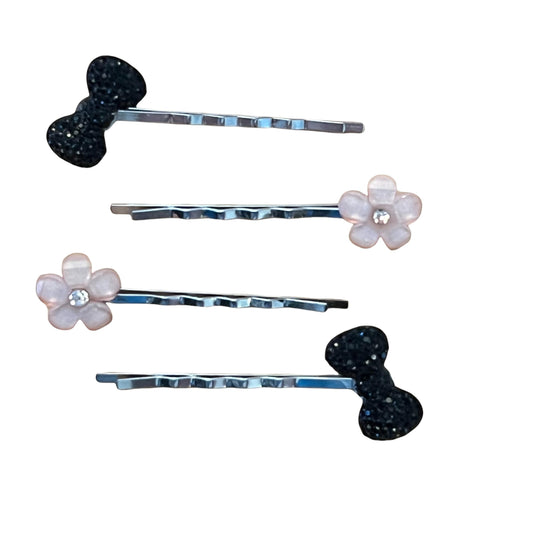 Pink Flower & Black Bow Bobby Pins Set of 4 Adorable Hair Pins