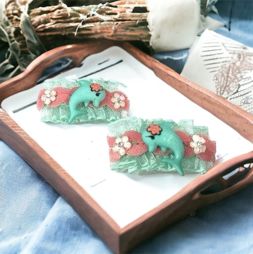 Mint Green & Pink Floral Dolphin Hair Clip Set - Cute & Playful Hair Accessories