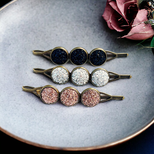 Set of 3 Druzy Hair Pins: Silver, Copper, and Black for Versatile Styling