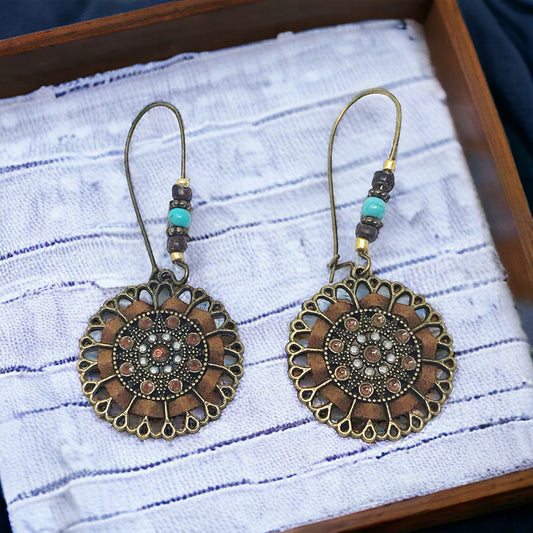 Boho Floral Filigree Earrings – Brass, Bead & Suede Dangle Jewelry