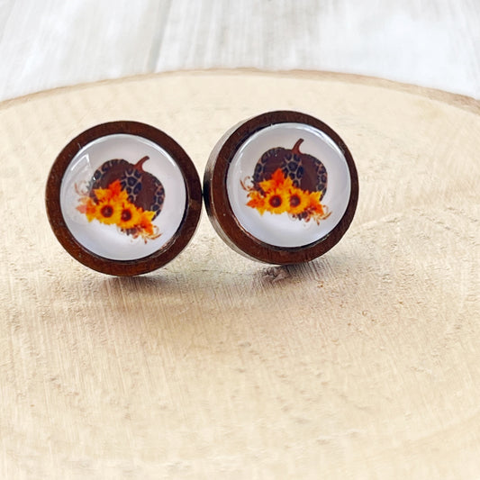 Leopard Pumpkin & Sunflower Stud Earrings – Rustic Fall Wooden Jewelry