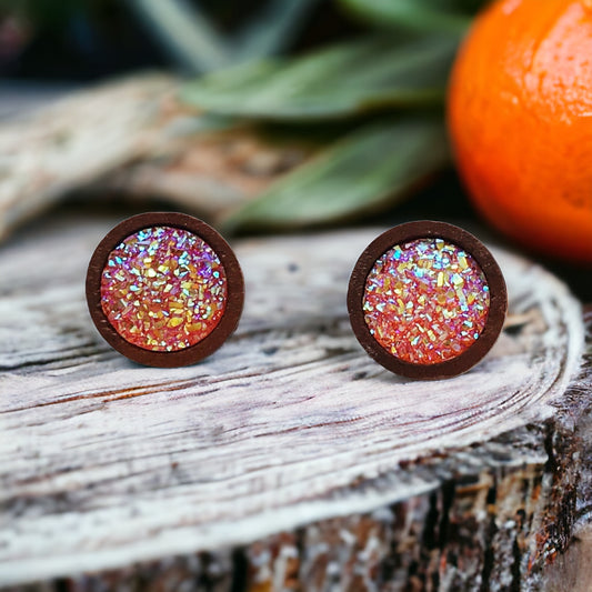 Orange Glitter Druzy Wood Stud Earrings - Sparkling & Vibrant Accessories