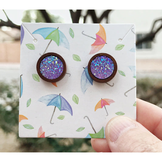 Purple Glitter Druzy Wood Stud Earrings: Sparkling Accents for Glamorous Looks