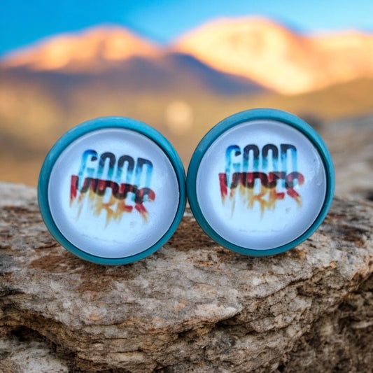 Good Vibes Stud Earrings – Retro Blue Framed Motivational Jewelry