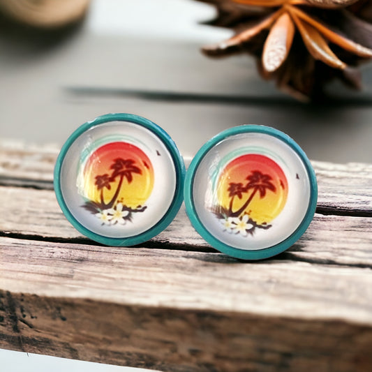 Sunset & Palm Tree Blue Stud Earrings - Tropical & Serene Accessories